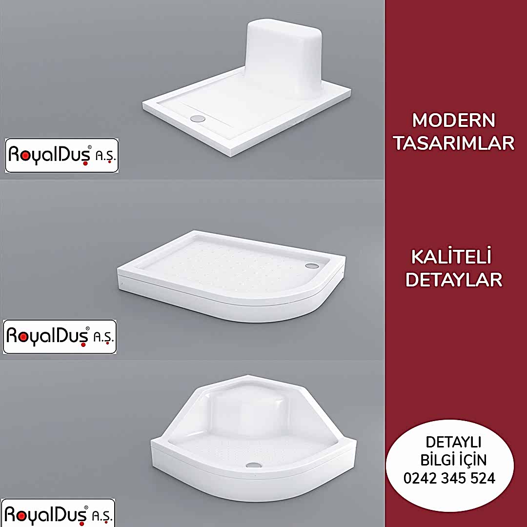 Royal Duş A.Ş. Küvet ve Duş Teknelerin de müşterilerine renk seçenekleri de sunmaktadır. Kırmızı, Siyah ve Beyaz renklerin dışında da proje bazlı diğer renklerinde üretimini yapmaktadır. Ürünlerimiz TSE ve CE sertifikalarına sahip üst kalite hammadde kullanılarak üretim yapılmaktadır.