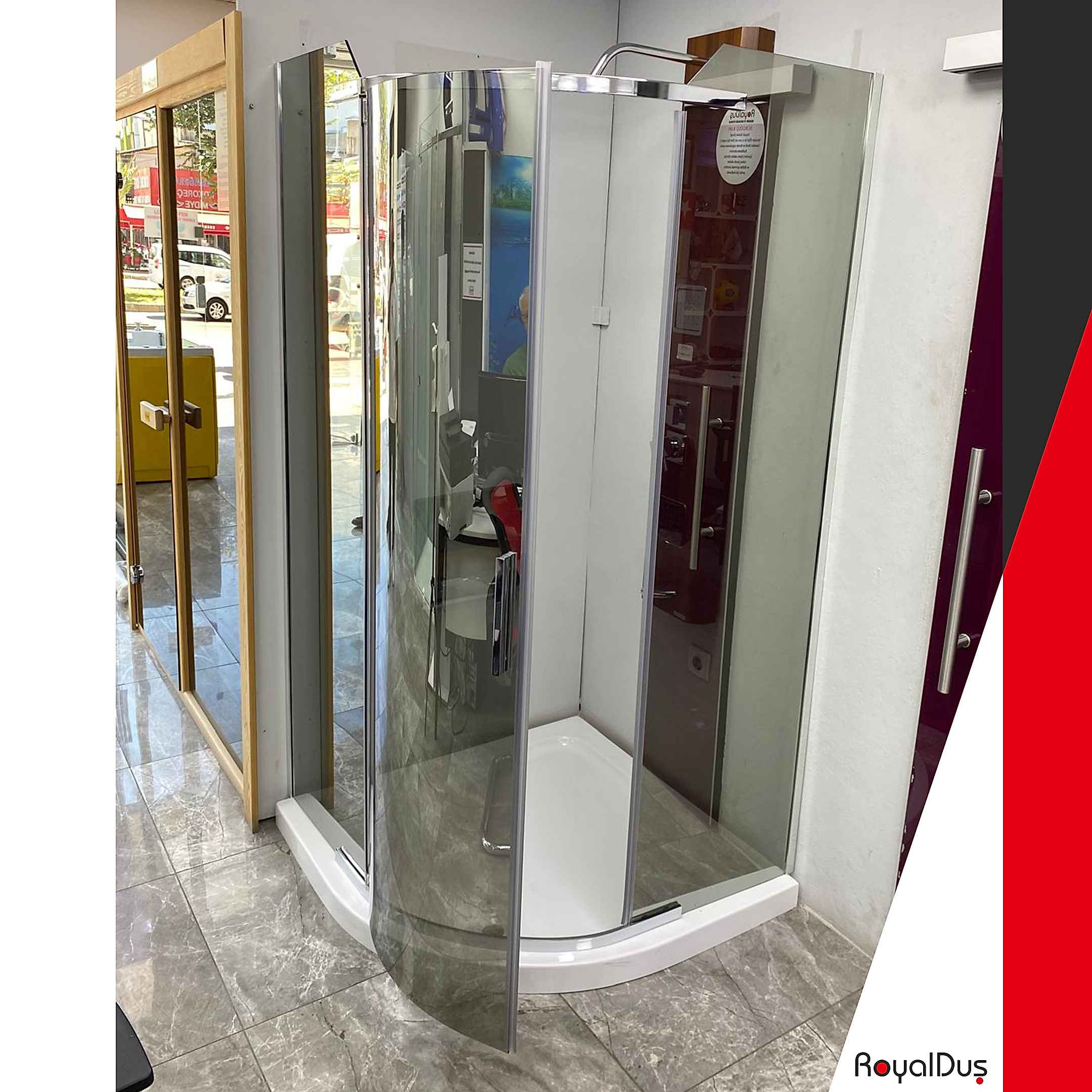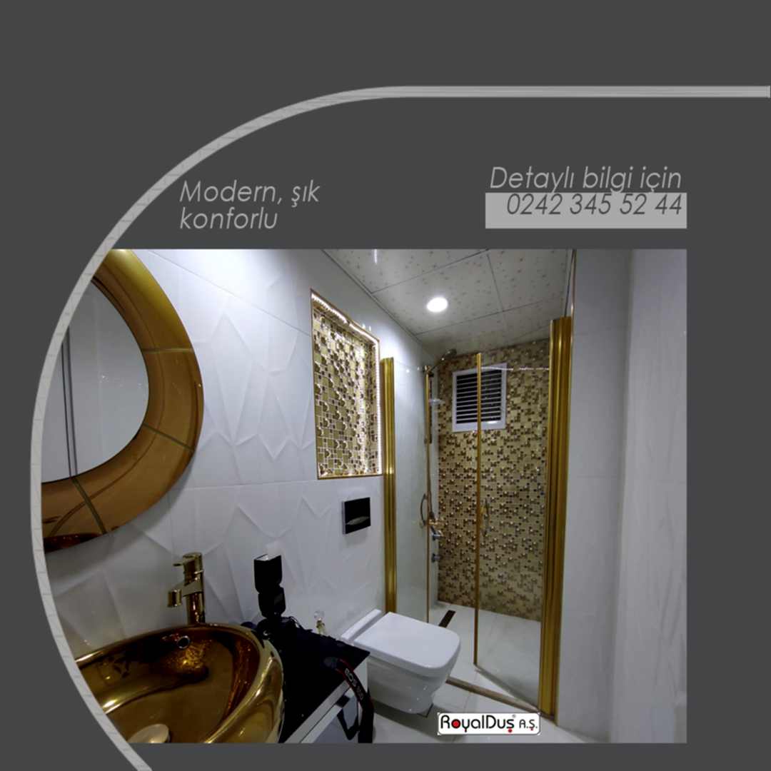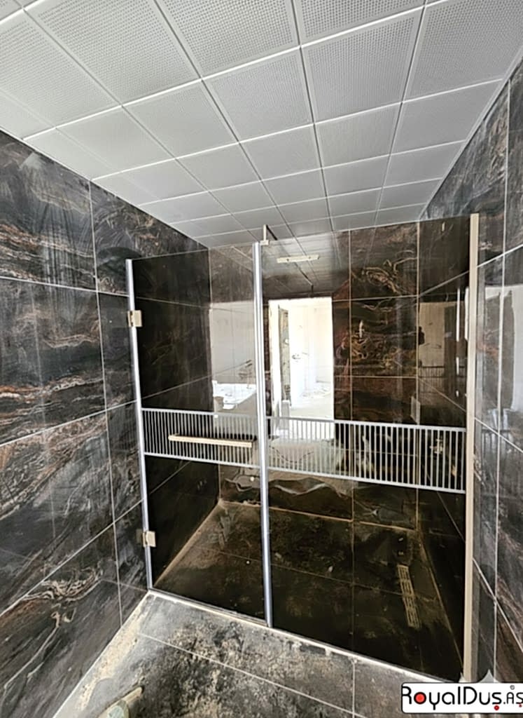 Royal Duş A.Ş. üretimi menteşeli duşakabinler; yüksek güvenlikli temperli cam, paslanmaz menteşe sistemleri ve özel ölçü üretim seçenekleriyle konut, villa, otel ve SPA projelerinde yoğun olarak tercih edilmektedir.